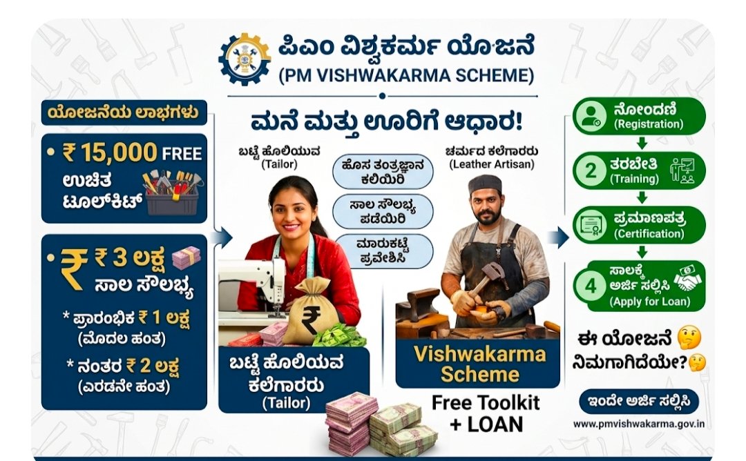 • PM Vishwakarma Loan: ₹15,000 ಉಚಿತ ಸಾಧನ ಸಹಾಯ + ₹3 ಲಕ್ಷ ಸಾಲ – ಕೈಗಾರಿಕಾರರಿಗೆ ಸುವರ್ಣಾವಕಾಶ!