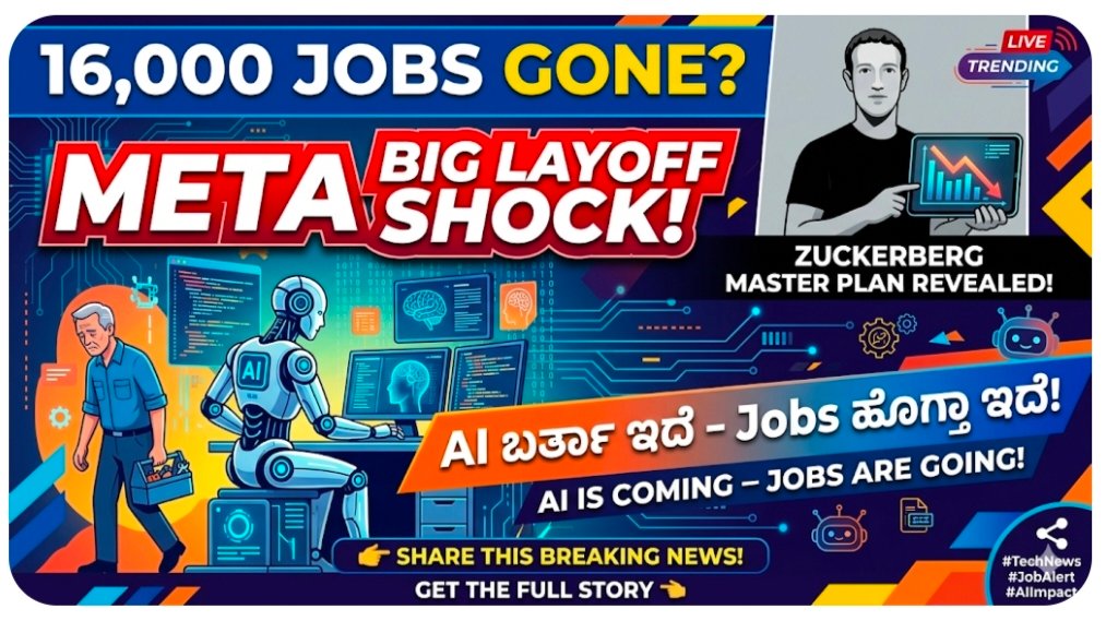 ಮೆಟಾ ಕಂಪನಿಯಲ್ಲಿ ಮತ್ತೆ ಭಾರೀ ಲೇಆಫ್ ಭೀತಿ! 15–16 ಸಾವಿರ ಉದ್ಯೋಗಿಗಳಿಗೆ ಗೇಟ್ಪಾಸ್ ಸಾಧ್ಯತೆ. ಎಐ ಯೋಜನೆಗಳ ಹಿಂದೆ ಇರುವ ಸತ್ಯ ಏನು? ಸಂಪೂರ್ಣ ವಿವರ ಇಲ್ಲಿ ಓದಿ.