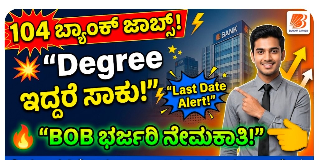 👉 ಬ್ಯಾಂಕ್ ಉದ್ಯೋಗ ಬೇಕಾ? BOB ನಲ್ಲಿ 104 ಹುದ್ದೆಗಳು : BOB Recruitment 2026: ಬ್ಯಾಂಕ್ ಉದ್ಯೋಗ ಹುಡುಕುತ್ತಿರುವವರಿಗೆ ಸುವರ್ಣಾವಕಾಶ! 104 ಡೆಪ್ಯೂಟಿ ಮ್ಯಾನೇಜರ್ ಹುದ್ದೆಗಳಿಗೆ ಅರ್ಜಿ ಆಹ್ವಾನ
